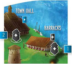 5. Place all White and Grey Workers on their required raiding spaces (Worker icon at top right of each raiding space). These are collected during raids. Place 3 Black Workers in the Village. These should be on the Gate House, Town Hall and Treasury (buildings with a blue card icon).