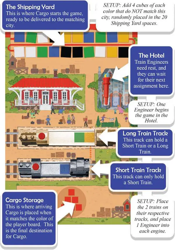 Players will control one or more Cities and by doing so can organize Cargo and Trains in order to deliver the correct color Cargo to the Cities which need them (Cargo goes to the City of the same color).
