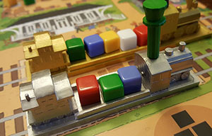 Simply place the Cargo onto any Train parked in the Station Area which still has space left to load it. Remember that a Long Train can hold 5 Cargo, and a Short Train can hold 3 Cargo. It is not a legal move to try to overload a Train.
