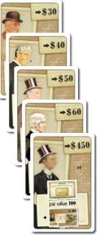 This cash is taken from the bank. Alternatively, a player may exchange one of his certificates for a certificate of lesser share value in the bank. In that case, the player only receives the current share value for that Holding multiplied by the difference in 10% share values represented by the two certificates.