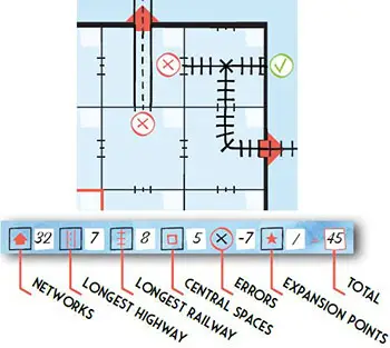 Then, each player must check for incomplete Routes. Each end of a Route that does not connect with any other Route or the outer edge of the board counts as an Error. Mark each one of these Errors with this symbol:
