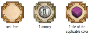 Costs: Depending on what action space you place a worker on, you might have to pay costs for being allowed to carry out the applicable action. Some spaces are for free; for others, you have to give up dice or money. How much it costs to place a worker on an action space is shown on the action space itself.