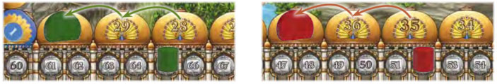 Besides the inactive workers, the two scoring tracks also have special spaces; when you reach or cross them, you immediately get the corresponding bonus.