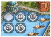 Every time you place a worker at the harbor, you may advance your boat up to three unoccupied spaces on the river, depending on the number on the die you have given up. The harbor provides space for several workers. The first worker placed here doesn't cost anything; workers placed later cost 1 or 2 money.