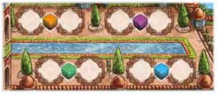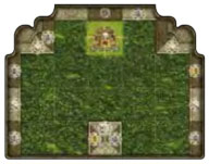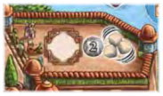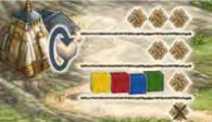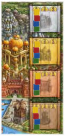 The province board shows the territory that you, being a raja, control and strive to expand. Your residence is in the middle on the top; from there, 3 roads lead into the country. Every time you add a new province tile, the end of one of its roads has to connect to an already-existing road, so that there is a connection to the residence.