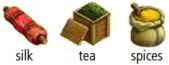 Example:There are 4 markets on display in Rajesh's province - three of them with tea and one with silk. If he places one of his workers on this market space, he can score for 2 markets: the silk market plus one of the 3 tea markets. For this, he gets 5 money.