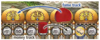 Attention: A bonus applies only to the track where it is printed. If, for example, your money marker passes a bonus space printed on the adjoining fame track, you don't get the bonus from there, of course.