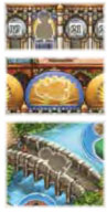 When you have added a new tile to your province, you immediately score money and/or fame for it. Some tiles show one or two market tents with certain goods (silk, tea, or spices) of a certain value; other tiles show one or two buildings (temple, palace, fort, or mill); and a few tiles show a combination of both.
