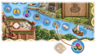 For example, if you roll a "2", you place the first river tile on the second space and, in doing so, replace the 2 karma shown there.