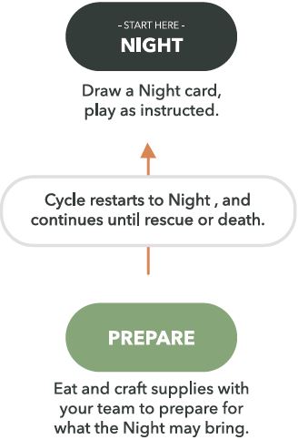 Choose the number of Nights your group will attempt to survive, and place that number of Night cards face down in a pile, in the center of the group. Find and shuffle "The Rescue" card (it's disguised as a Night card) into the last 3 Night cards on the bottom.