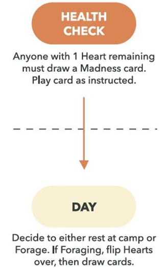 If a player drops to 1 Heart at any point during Health Check (e.g. due to an effect of another player's Madness) they must also draw a Madness card. After the chaos of any Madness, dawn breaks, and Day begins.