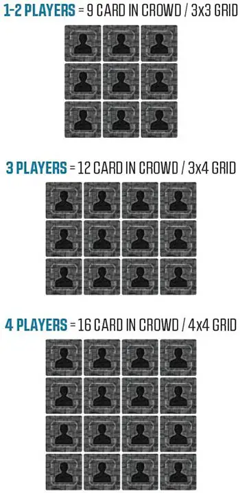 During crowd setup phase, create the crowd for the day by dealing cards from the population draw pile facedown into a grid. The number of cards in the grid is determined by the number of players in the game: