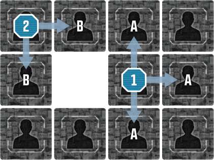 - The card labeled 1 is NOT adjacent to any card labeled B.