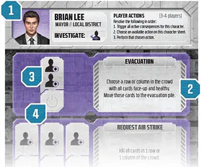 Player Actions: Players investigate cards, manipulate the crowd, and attempt to move healthy cards to the evacuation pile until the end of day is triggered.