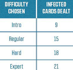 Separate the healthy population cards from the infected population cards. Shuffle the infected cards and deal a number of them facedown into a pile. The dealt depends on the difficulty level the players choose, as noted in this table.