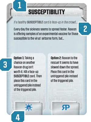 Players work as a team and win or lose together. To win the game, move all healthy population cards from the population to the evacuation pile before the city is overrun or Raxxon gains enough power to take over.