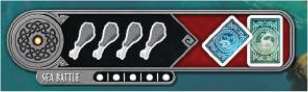 In order to defeat a battle at sea, a player must either spend exactly the combination of Crew Dice displayed or defeat the Battle in combat. To do combat with a Battle at Sea card, discard any number of Crew dice showing a hammer symbol and collect that many Combat Dice from the supply.