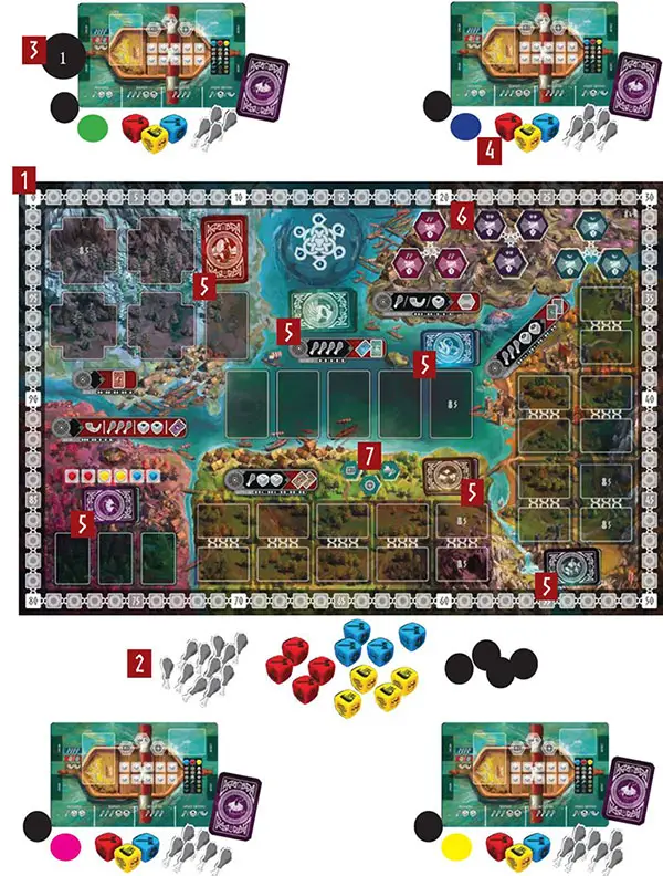 4 Give each player the following: 1 Longship Board , 1 Longship Pawn, 3 Crew Dice 1 Favor Token, 1 Prophecy Card, 4 Food