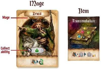 Mages and items are chosen during setup and begin in play. Each round, when a player passes, they will turn in their item for a new one.