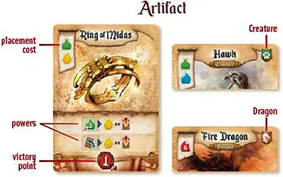 Each player has a personal deck of 8 artifacts, 3 of which form their initial hand. Artifacts are put into play by paying their placement cost in essences. Some artifacts are also Dragons or Creatures. A few artifacts are worth points.