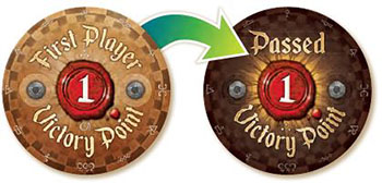 If you are the first to pass in a round, take the First Player token - worth 1 point when checking victory - and flip it over to its Passed side.