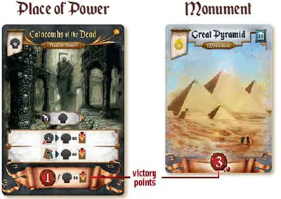 Monuments and Places of Power are claimed from the center by paying their placement cost in essences. Once claimed, a monument or Place of Power cannot be taken by another player. Monuments and Places of Power provide the majority of players' points.