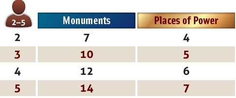 Shuffle all the monuments together. Deal the number shown above to form the initial deck and return any unused monuments to the box (without examining them). Then draw 2 monuments and place them face up in the center.