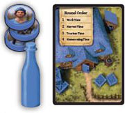 Stack the game round tiles in ascending order (i.e., 1 on top, 7 on bottom). Place this stack on the marked space, either on the game board or on the covering tile. (Game round tile 8 is only needed for Story Mode).