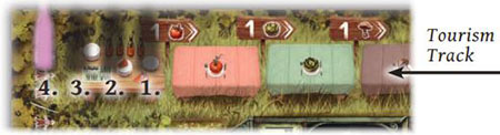 In rare cases, it is possible to finish the entire tourism track. If you do, place your manager back at the start stable and keep going, but treat each table like it shows +6 goods of that type.