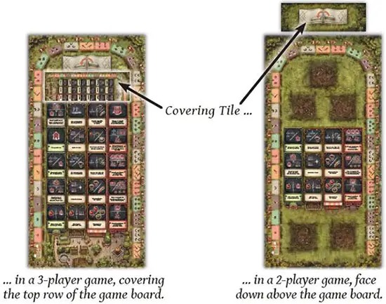 In a 3-player game, place the covering tile on the top row of the game board. In a 4-player game, the covering tile is not used at all.