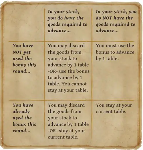 To advance your manager to a table, discard goods from your stock back to the supply, as shown on the signpost of that table.