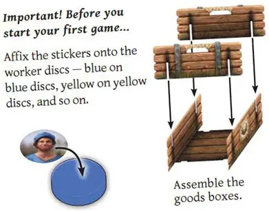 Each player chooses a color and takes the following pieces in their chosen color: 3 workers, 1 manager, and 1 player card. Unused player pieces are then returned to the box.