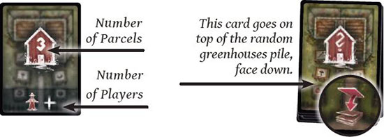) and return them to the game box.Sort the remaining greenhouse cards into separate piles by the number of parcels on their back. Place these piles in a row next to the game board, face up.