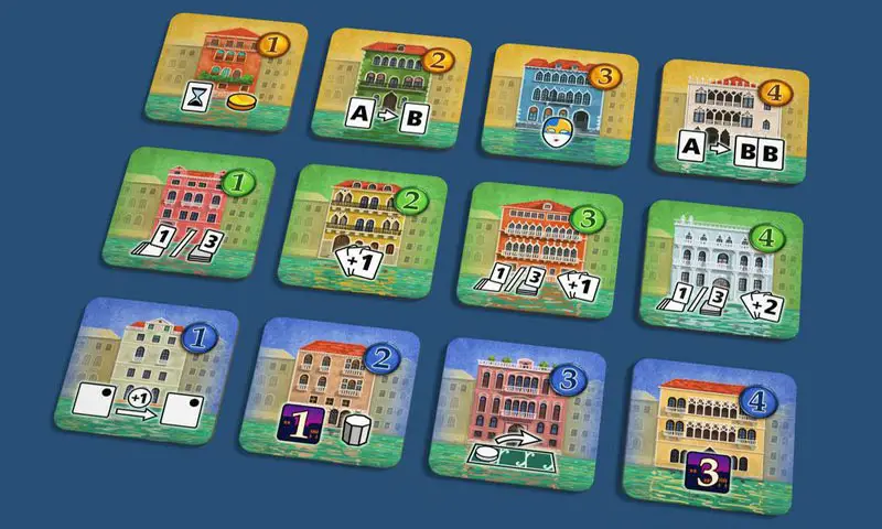 Players collect VPs both during the game - from special buildings and by building bridges between districts - and at the end of it - for majorities of council members in each district. The value of each district evolves during the game: Each district is adjacent to four other ones, and at the end of the game, they will be connected either via bridges or gondolas.
