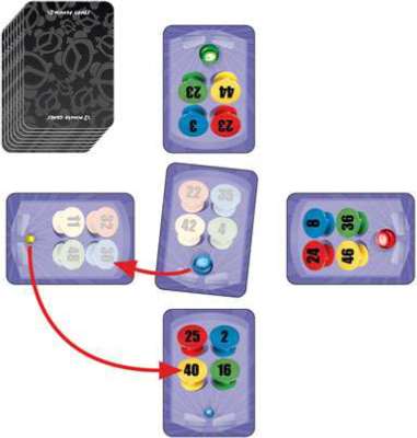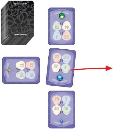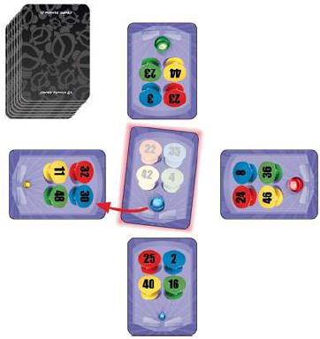 Turn over the top card of the deck into the center - this is the starter card. The ball on the starter card determines which of the four outer cards is next, becoming the 2nd card.