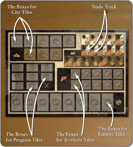 Initially, you place all of the progress tiles, territory tiles, city tiles, and empire tiles on the tiles display. In addition, the trade track is on the tiles display.