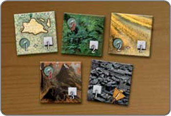 There are 40 territory tiles. Each depicts one of the various types of terrain. In general, for each of your territories, you earn player cubes (or some other benefit) and you either earn or lose food.