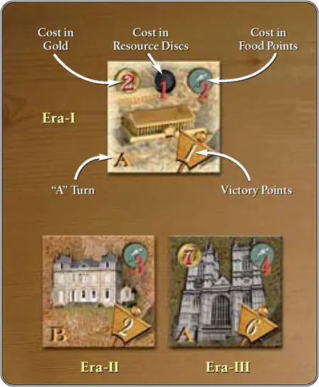 Note: The color of each tile corresponds to an era of the game. The Era-I tiles are available in the first era. Era-II tiles become available in the second era, while Era-III tiles become available in third era.
