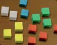 There are 150 wooden cubes, 30 in each of the five player colors (white, red, blue, green, yellow).