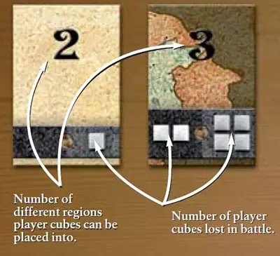 Each region contains a "standard" (banner) with two victory point values. In addition, each Era-I region and Era-II region contains a symbol. If you control a region at the end of a game turn, you receive benefits based on the region's symbol: additional player (population) cubes, gold, resources, or food.