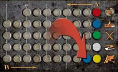 The core of the game is the action display, where you record each action you choose during a game turn. The first game turn in an era is called the "A" turn, the second one the "B" turn. In a way, the "B" turn is a mirror image of the "A" turn.