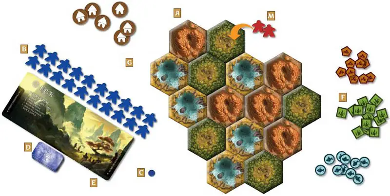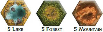 Take the number of hex-shaped Terrain Tiles equal to the number of players + 1 for each type of terrain. For example, if you have 2 players, take 3 of each type. Extra tiles, if any, can be returned to the box.