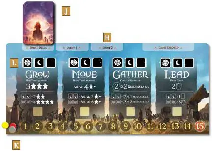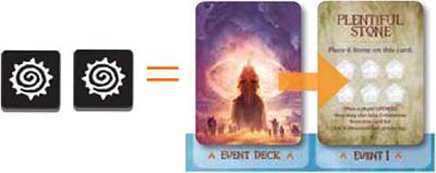 If a player rolls the same result on both dice, they trigger an Event (2 Suns, 2 Moons, 2 Blanks). The player then draws the top card from the Event Deck and places it in an empty event slot above the Action board.