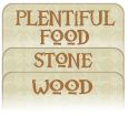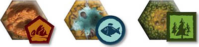 Obtain resources from the hexes you occupy as specified on the Action Board. Forest produces wood, lake produces food and mountain produces stone.