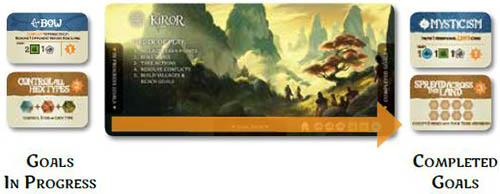 Goals "in progress" are kept face up on the left side of the player's board (as shown), and then moved to the right side when completed. Once completed, points gained cannot be lost, and any abilities granted are for the rest of the game.
