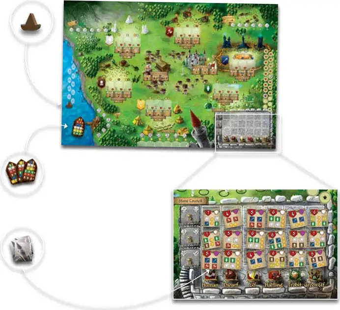 Players gain victory points by upgrading their land value, by housing Settlers and helping them become Apprentices and Guild Masters (it's always good to have friends in influential places), and by fulfilling various demands from the Stone Council.