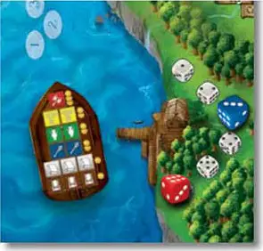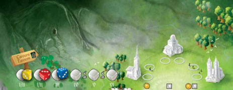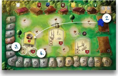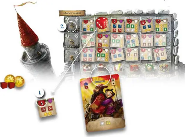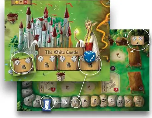 Example: Sara places a die of value 2 on Cavern Tavern and takes a Settlers card. Katie is next and she has to place a die of 2 or higher. She places a 3. Melissa is next and she needs to place a 3 or higher. She places a 6.