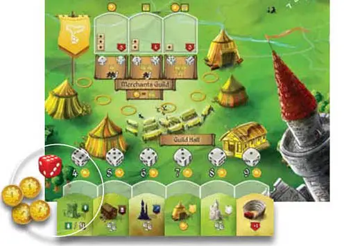 At the Guild Hall, you can buy a Workshop or a Community Building. The Guild Hall has 6 die slots with a specific die value and cost associated with each slot.