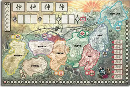 The heart of the board shows the Map of Japan, which is where most of the conflicts in the game play out.