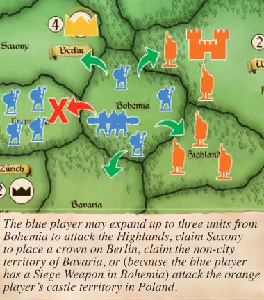 You may use your army to expand into an unclaimed city territory to take control of that city and gain its crown(s).